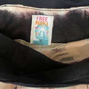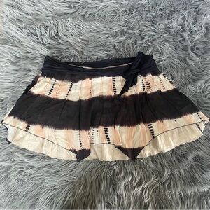 A bohemian style mini skirt with tie dye woven pattern, pleating detail, sash tie, and uneven hemline. Zip and hook closure. Lined.