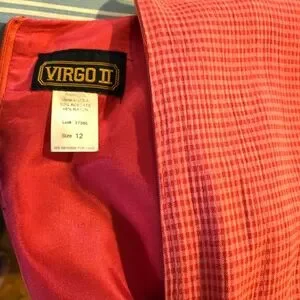 Stylish, sharp looking shift dress with built-in tunic by Virgo II, size 12. Fabric is an acetate/rayon blend, light red in color. Shift is a solid light red color crinkle fabric with a tiny checkered, short sleeve tunic look jacket attached. For the office this is a professional yet casual look; travels well. Perfect for any occasion where you want to look stylish and pulled together! Definitely a unique, attention-getting look!