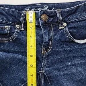 Excellent pre-owned condition, American Eagle Stretch women's dark wash blue denim jean shorts, size 2.