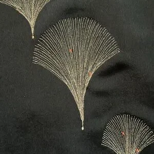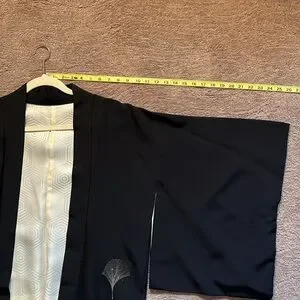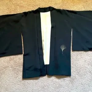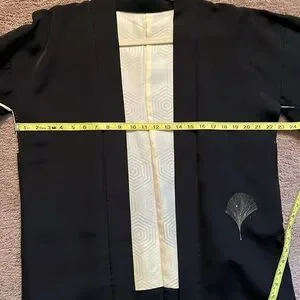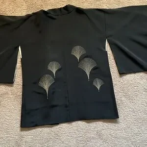 This is a one-of-a-kind custom-made kimono-styled jacket. Constructed of black silk and fully lined with cream silk. There golden-thread fronds embroidered on the front and back. This is a beautiful piece that will make you stand out in any crowd.