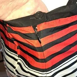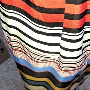 Jessica Simpson size M sundress. Has horizontal stripes in red, blue, black, tan, lime green and cream. Black straps button in back, can criss-cross also. There is a silicone band on the top of the dress, has a slit in back. 100% polyester. No tears or stains. EUC.