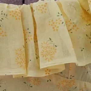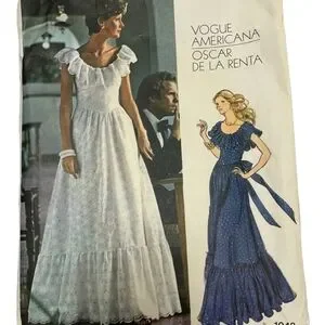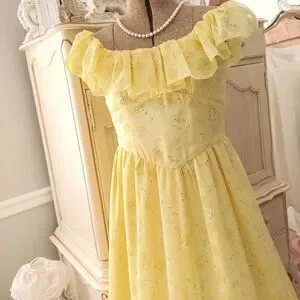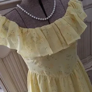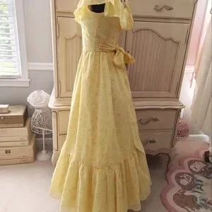 GORGEOUS HOMESPUN VINTAGE 1970S MAXI DRESS THAT LOOKS LIKE SHE WAS WORN BY "BELLE"! FABRIC IS A SEMI SHEER, FLOCKED LEMON YELLOW WITH TINY GREEN AND ORANGE FLOWERS! FEATURES GATHERED, NON ELASTIC FRONT RUFFLE ALONG DECOLOUTE AND BACK, SLIGHT DROPPED WAIST, ATTACHED LONG BACK SASHES TO FORM A SWEET BOW AND A BEAUTIFUL ATTACHED 14 IN. BOTTOM RUFFLE. SHE HAS BEEN METICULOUSLY HOMEMADE WITH ATTACHED YELLOW SATIN BODICE LINING AND UNDERSKIRT AND A LAYER OF PALE YELLOW CRINOLINE, WITH RAW EDGE. SHE HAS A MATCHING LONG YELLOW BACK NYLON ZIPPER AND TOP HOOK N EYE CLOSURE. ALTHOUGH FOUND IN A DRY CLEANER PLASTIC BAG, I CAREFULLY MACHINE WASHED HER ON DELICATE AND HUNG TO DRY, THEN CAREFULLY GAVE A GENTLE PRESS. SHE IS READY FOR HER NEW OWNER. SHOWN WITH A BRIDAL SLIP UNDERNEATH FOR ADDITIONAL FULLNESS. MEASUREMENTS FLAT: SHOULDERS APPROX. 16, B 16, W 13.5, L 51 INCHES. BOTTOM SWEEP IS 100 IN. A GOOGLE LENS SEARCH LOOKS LIKE THE SEAMSTRESS MAY HAVE USED THE OSCAR de LA RENTA VOGUE PATTERN SO POPULAR IN THE 70S!