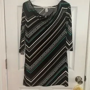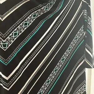 Black, teal and white in color. Scoop neck with 3/4 length sleeves. Small side slits and unfortunately fabric tag was removed, but it’s a stretch rayon material. Xs in size.