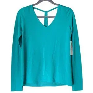 Jessica Simpson DRM Catcher Performance Activewear Top is a teal pullover designed for athletic women. Made of a polyester blend, it features long sleeves and is machine washable. The top is available in size S and is a regular fit.