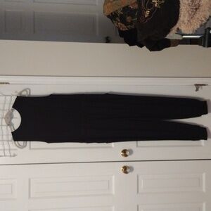 Material is one of the best I have ever seen.Well made.Like new.Has 2 pockets,belt is made in to waist.Closure snap on v @ bodice.Bottom of legs is made like 2" of soft material for better fit.This is beautifully made with the best of design and material.L 58" blousens @ waist,18" pit to pit size L. stretchy material.I am 5'6 weigh 210 fits me perfectly.