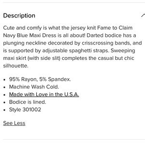 lulu’s jersey knit fame to claim navy blue maxi dress. bodice has a plunging neckline decorated by crisscrossing bands & supported by adjustable spaghetti straps. maxi skirt (with side slit) completes the casual but chic silhouette!