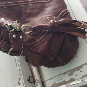 EUC with very little evidence of wear. Saddle brown leather hand/shoulder tucks securely under the arm. Quality brass hardware, expandable side snap tabs, inside large zip pocket and a magnetic close compartment. Love the embellished chunky tassle just for fun! 16"W, 12"H, 6"D at widest. Strap drop 7"