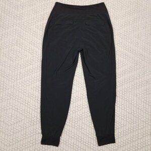 Athleta "Soho Joggers" in black. Size 6. Perfect for travelling. These lightweight pants are breathable and feature 4 way stretch, a soft wide waistband, 2 zippered hand pockets, 2 rear pockets with flaps, are sweat-wicking and quick-drying, and has soft cuffs at the ankles. Fabric: 86% recycled polyester, 14% spandex. Excellent condition - no flaws.