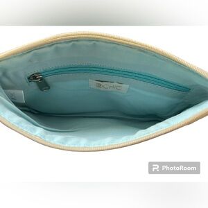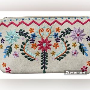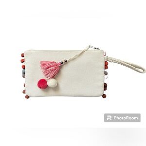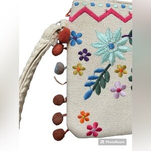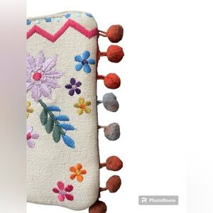 Adorable, used 2 Chic wristlet clutch. Super cute floral embroidery is accented with mini poms on both side seams and a fringe with poms adorned zipper tassel. Zip top and interior zipper pouch. Lining is gorgeous blue color.
