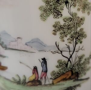 This is a beautiful white milk glass that looks to me like it is hand painted. It does have a repair on the side of the glass at the top and a few small chips on the lip of the gold rimmed top, shown in pictures below. It is especially precious with a flameless candle inside to illuminate the beautiful scene. It has 3 little marks on the inside that look intentional. It measures 4 1/4" high and 3 1/4"wide.
