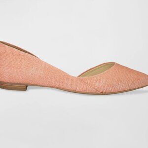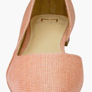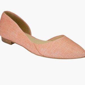 Marc Fisher LTD Sunny Half d'Orsay Flats are pink ballet flats that combine contemporary and timeless style. They feature a smooth leather upper, soft man-made lining, cushioned EVA footbed, and easy slip-on style. These flats also have a closed pointed toe silhouette, stacked low heel, and durable synthetic rubber outsole. Reviews note that they are attractive and comfy, but one reviewer says the shoe material is stiff and hurts to wear.