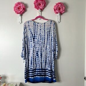 Dillards Dotti Tie Dye Print V-Neck 3/4” Sleeve Tunic Cover-Up Dress, Size Medium. Tie Dye fades from navy blue to cobalt blue to baby blue adorned by white background. Sleeves are adjustable w/ties and feature silver-tone beads. Purchased from Dillards Florida and in like new condition. Wear it as a cover up or a dress - she’s stunning. Lightweight, not clingy, but flowy. 95% polyester, 5% spandex. No rips, stains or tears. Worn a few times but always delicately washed and line dried.