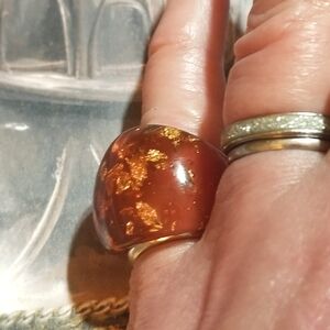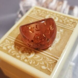 Vintage Lucite in an Amber (reddish brown) with Golden Flecks Modern 1960s Era Ring in Excellent Vintage condition. Size 6. It's just a Fun Bold Ring!
