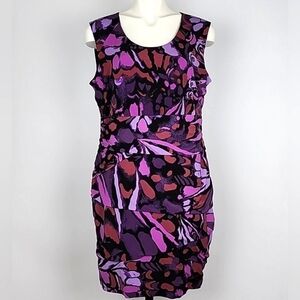 Excellent pre-owned condition, elegant and versatile Ricki's sleeveless tiered, lined, sleeveless sheath dress in varied purple motifs with black detailing in a drapy stretch material and slight, flattering rusched tapering at the waistline, size XL.