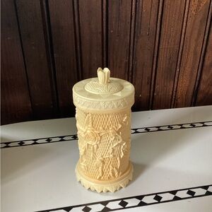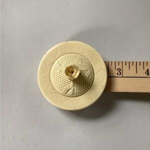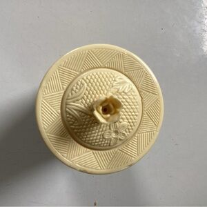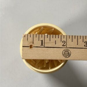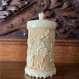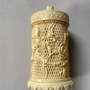 In good old used condition 1978. Faux ivory ~cream colour latticed/ rose container with 34 appetizers/cocktail forks. This set was a boon in teaching my girls to keep their grubby fingers from the fruit platter and assorted items on the cheese board. The container does have some discolour, please see photographs. Plastic/celluloid?