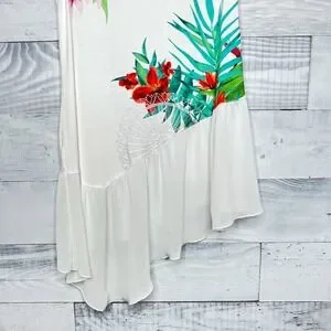 Desigual tropical print sleeveless top with asymmetrical hem. It also has a small metallic detail on the front. Super pretty top! Excellent condition.