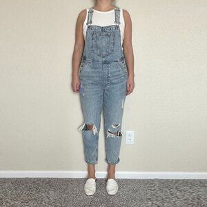 LIght-blue denim overall with distressed pants and a front pocket. Like-new condition. True to size.