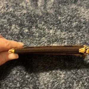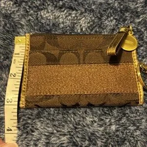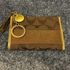 Brown cloth with signature c’s card holder. Zip top with striped lining. Outside pocket on one side. Attached keychain. Has zipper pull and round coach dangle. Color is shades of brown with metallic looking stripe. Great condition.