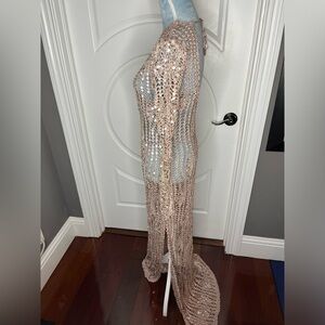 Long sleeves, a high slit, and curve-hugging fit—our Cherri dress is the party-ready solution to any seaside soirée. A hand woven motif is carefully showcased throughout the crochet silhouette detailed by embellished sequins. Shown here in Rose Gold.
