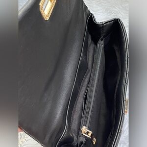 - featuring black and gold, six-inch drop chain handle with detachable crossbody chain