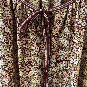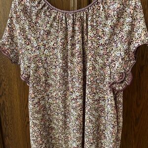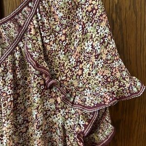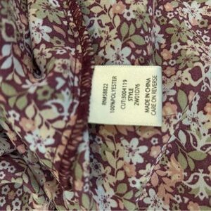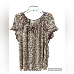 Max Studio Women’s shirt, floral multi maroon cream and green with ruffle sleeves and tie neck, 1X