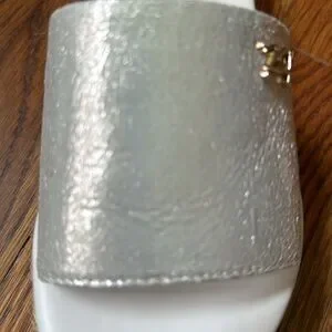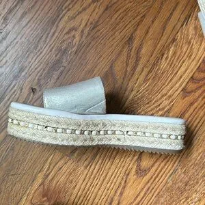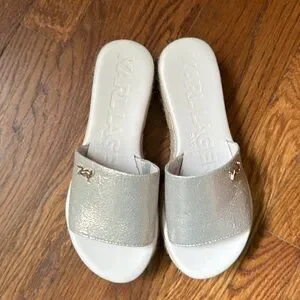 These are brand new Karl Lagerfeld platform sandals. It is a champagne cracked leather top and the bottoms are a natural jute fabric with gold stitching.