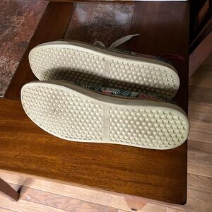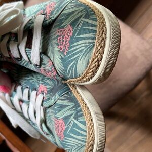 Vionic heavy canvas with a tropical palm and coral design with a hemp trim. Size 9 in excellent condition.Shoe trees not included.