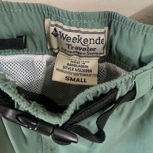 Weekender “Traveler” swim trunks size small, green. Lots of pockets and zippers, great for hiking and the river.