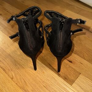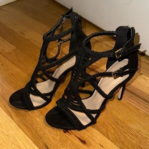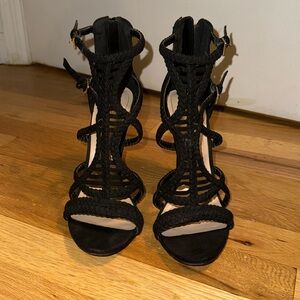 Black Sinfony Heels size 8.5 in great condition! A beautiful shoe with black crochet straps and buckle details. Zips in the back to put on. Make me an offer!