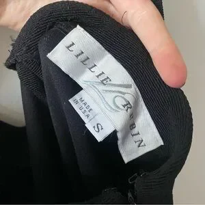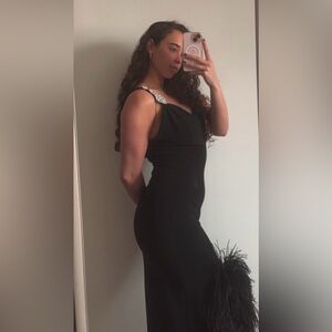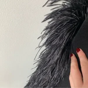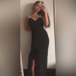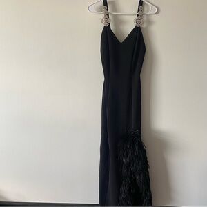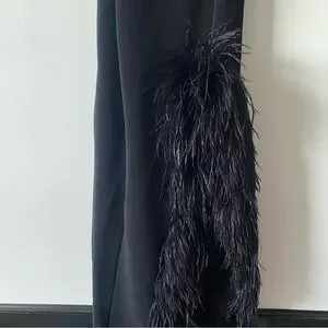 Vintage 90s Lillie Rubin Black Crystal Detailed Strap Feather Slit Evening Gown