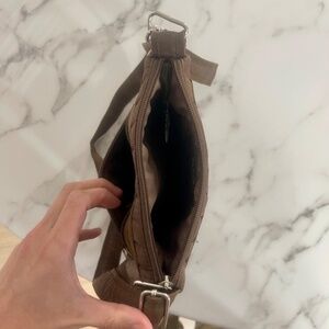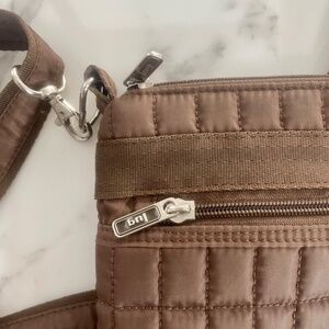 Functional and waterproof crossbody bag in the color brown with quilted squares pattern. It has two zippers and a back pocket. You can wear it as a shoulder bag or crossbody. Measurements: 9” x 8” x 1.5” with an adjustable handle/strap drop that goes from 14” to 28”. A very lightweight bag, perfect for traveling!