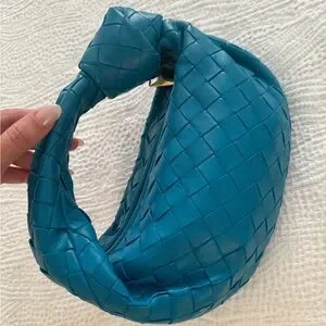 Intrecciato-woven buffed lambskin top handle bag in blue.