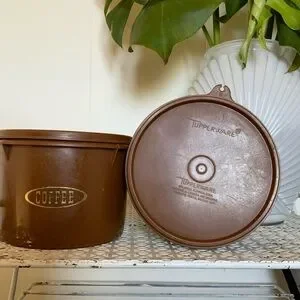 Set of 2 vintage Tupperware tea and coffee canisters, in good condition for age, scratches add to the charm of this matching set. made in Canada. Gold lettering for tea & coffee. The coffee pot has a piece of the rim broken off but luckily it’s not obvious.