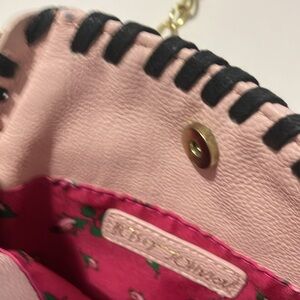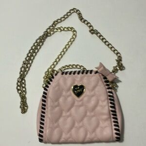 Betsy Johnson pink quilted heart purse with a chain strap. This item is used. It is in good condition. It is a smaller bag, but still has plenty of room.