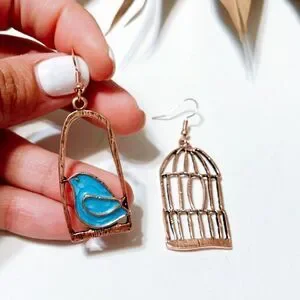 Bird and cage boho dangle earrings in rose gold tone