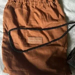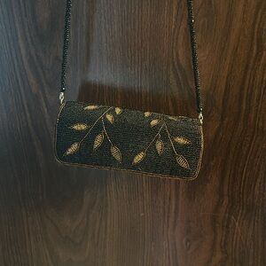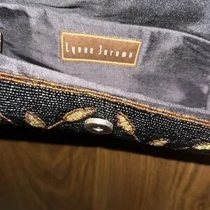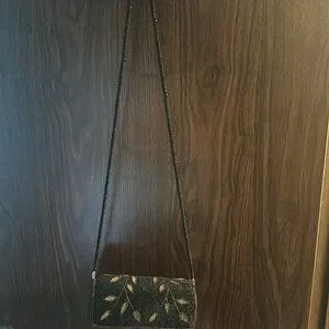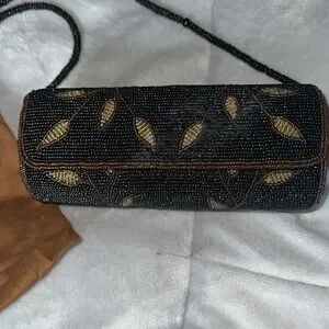 This is a Lynne Jerome round beaded over the shoulder purse. Black stunning beaded shoulder strap. Round part is done in a solid black bead with stunning detail throughout with brown stems and leaves Perfect for an evening out