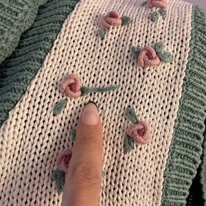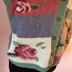 This vintage knit floral sweater vest just screams 80’s! This vest is super cute, features ornate metal buttons, and only 2 minor flaws for its age (pictured). Vest is marked a size medium, but go by measurements provided for best fit.