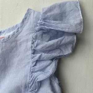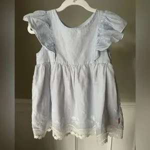 Adorable BCBG girls dress size 6. Blue and white stripe with beautiful lace along the hemline. Flutter sleeves and a keyhole in the back. Excellent used condition!