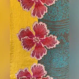 Color is khaki green with lovely colorful prints and some soft shiny gold details.