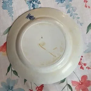 This is a vintage dinner plate from Royal Ventonware by John Stevenson and Sons, manufactured in England. The 9” dinner plate features a classic blue and white patterned landscape. The blue and white side of the plate is in pristine condition with no chips or cracks. The back of the plate features the stamp and it also has some staining and discoloration.