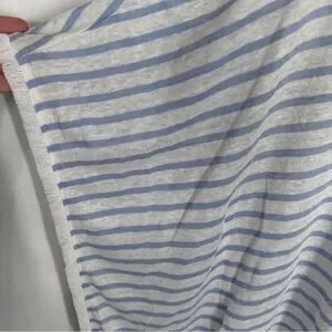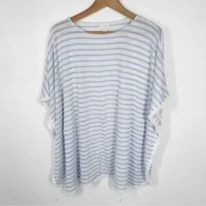 Elevate your casual style with this J. Jill Women's Striped 100% Linen Poncho Top in White and Blue. The lightweight and breathable knit fabric type makes it perfect for warm weather. The blouse features a stylish striped pattern, kimono sleeves, and fringe accents. Size XS/S.