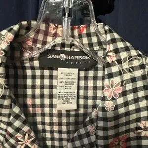 Button up top with a tie back detailing. Black and white gingham with pink flowers and butterflies. Size is listed as petite, but I would say fits like a small.