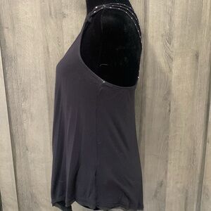 This beautiful strappy tank top is from a collection designed by Candies fashions. This top has a V neckline with shoulder straps that cross together in the back to create a dramatic design. It is a light cotton fabric in black. It has an uneven hemline by design. The length of this piece is about 28". This top has been professionally cleaned. Piece is free of rips, holes, tears & stains. It has been in storage in a non-smoking home. If you have any questions please message me. PLEASE REVIEW PICTURES.
