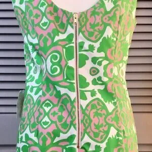 Kaeli Smith sleeveless pink and green print dress. Fully lined. Overall length is 34” and from pit to pit measures 18.5”. (Measurements were taken while dress was laid flat and are approximate.) 98% Cotton and 2% Spandex. Never worn. Size 10