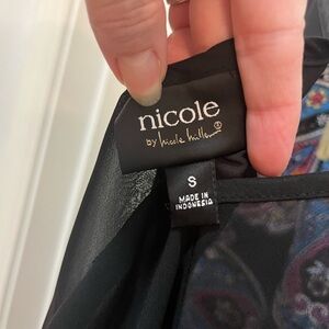 Sleeveless blouse with black shear back. It has a duck tail back and is super cute with slim jeans and black heels. Nicole by Nicole miller. 100% polyester.