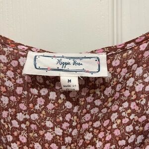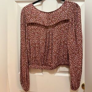 Brown and pink shades of small flowers. Long sleeve with crochet detail on front and back of top. Has elastic gathered bottom. In excellent condition.