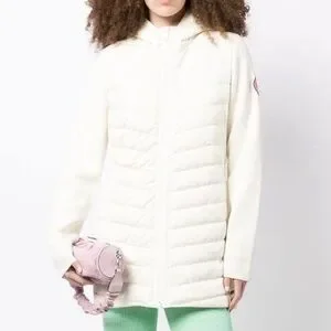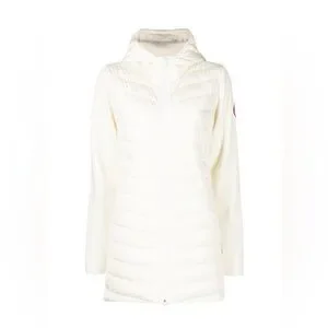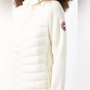 Padded with goose down for insulating properties and benefiting from Thermal Mapping® technology for added warmth, this cream-white iteration of the HyBridge® jacket boasts knitted sleeves spun from soft wool and a recognisable logo patch at the side - a signature Canada Goose motif.