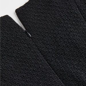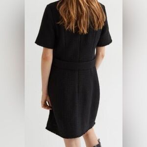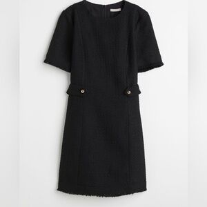 Short, slim-fit, A-line dress in woven, textured, wool-blend bouclé. Round neckline, short sleeves, and a removable, decorative belt with buttons. Lined.