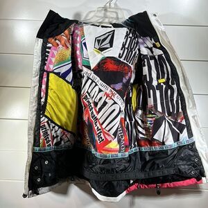Great looking ski/snowboard jacket from Volcom. Cost needs to be put through the washing machine as it has a couple spots here and there that would come clean. Has a small pin hole in the outer layer at the zipper level. Fantastic colorway on this cute snow bunny jacket. Measures approx 25” shoulder to hem and approx 16” pit to pit.