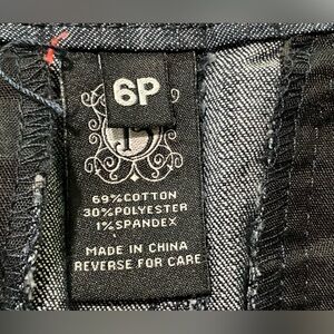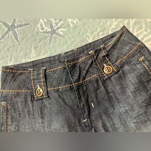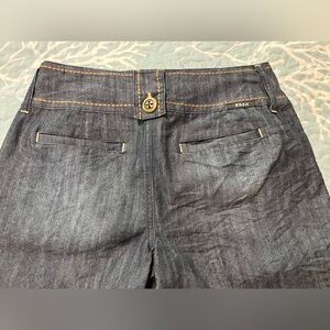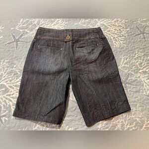 Beau Dawson woman size 6P shorts, waist measures 14”, inseam 10”, length 18”, color is dark blue denim with dark gold trim, front & back pockets, waist bank belt loops, fabric is 69% cotton, 30% polyester & 1% spandex, very good condition g